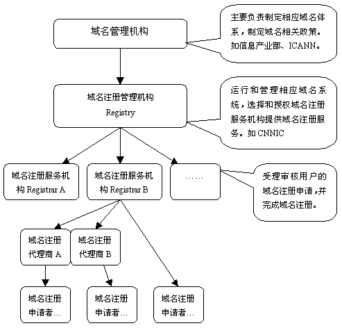 互联网域名注册管理与服务体系是层次化的结构,大致可以分为以下几层:域名管理机构、域名注册管理机构、域名注册服务机构和域名注册代理等。